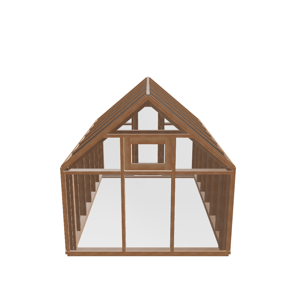 Tegning Drivhus 9 kvm med materialliste av reisverk. Denne er laget slik at man setter opp reisverket, dekker huset med plast. Til slutt settes på lekter for å holde plasten på plass.